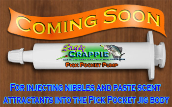 A NEW Product...COMING SOON!!! The PICK POCKET PUMP, designed with the nibble/paste scent attractant fisherman in mind. For injecting nibbles and paste scent attractants into Pick Pocket jig bodies and many other styles of jig bodies. No more nibbles squished all over the carpet of your boat, with the Pick Pocket pump, all your nibbles or paste scent attractants are neatly kept in the pump for easy injection into your favorite Pick Pocket jig. More info on the Pick Pocket pump coming soon.....